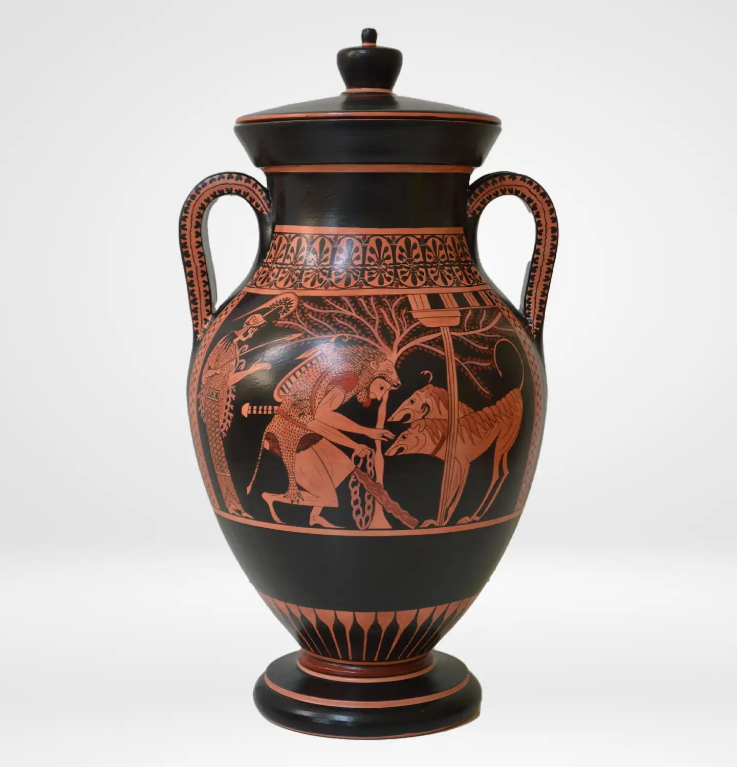 Heracles Taming Cerberus, Red and Black Figure Bilingual Amphora, Greek Pottery, Hand made replica, 47cm